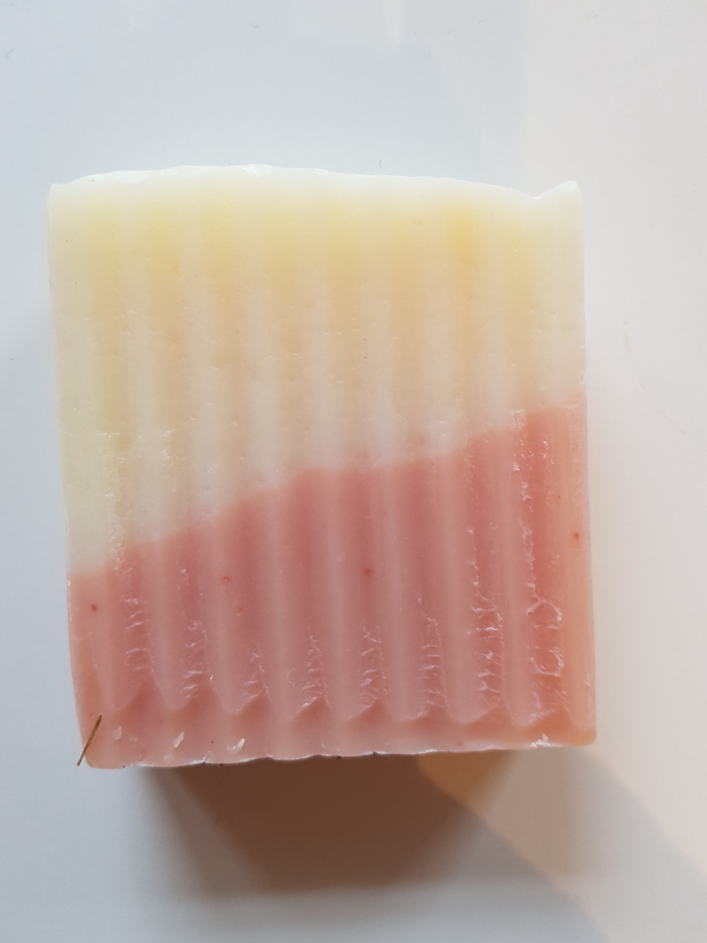 Inhaltsstoffe: Kokosfett*, Kakaobutter, Mandelöl*, Rizinusöl, Jojobaöl, Rapsöl*, rosa Tonerde, Wasser, NaOH